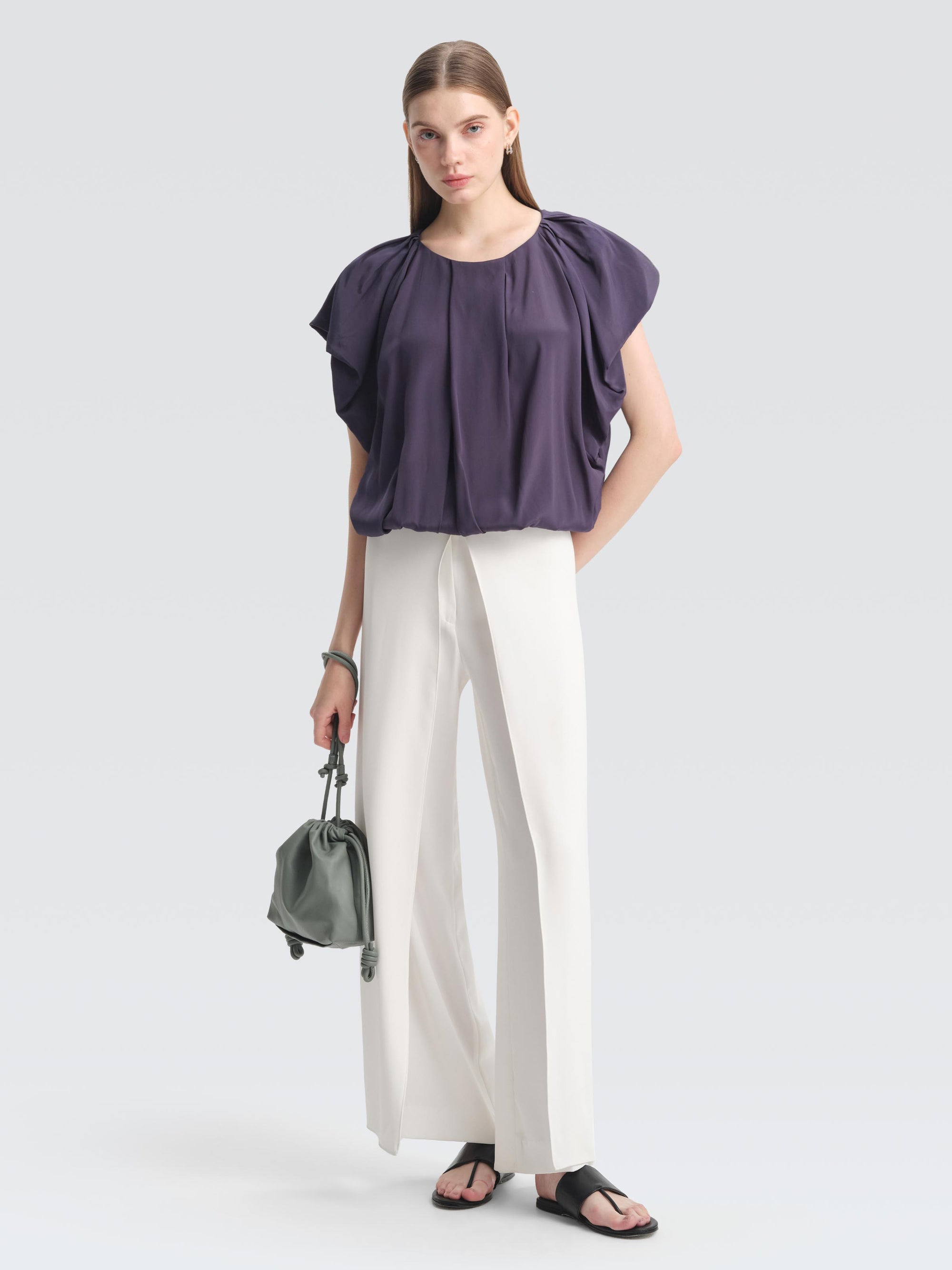 The FELLLINI top is crafted from crepe de chine in a modern silhouette, shaped by pleated shoulders and a bubble hemline for elegant volume. Pair with sleek trousers to highlight its contemporary form.