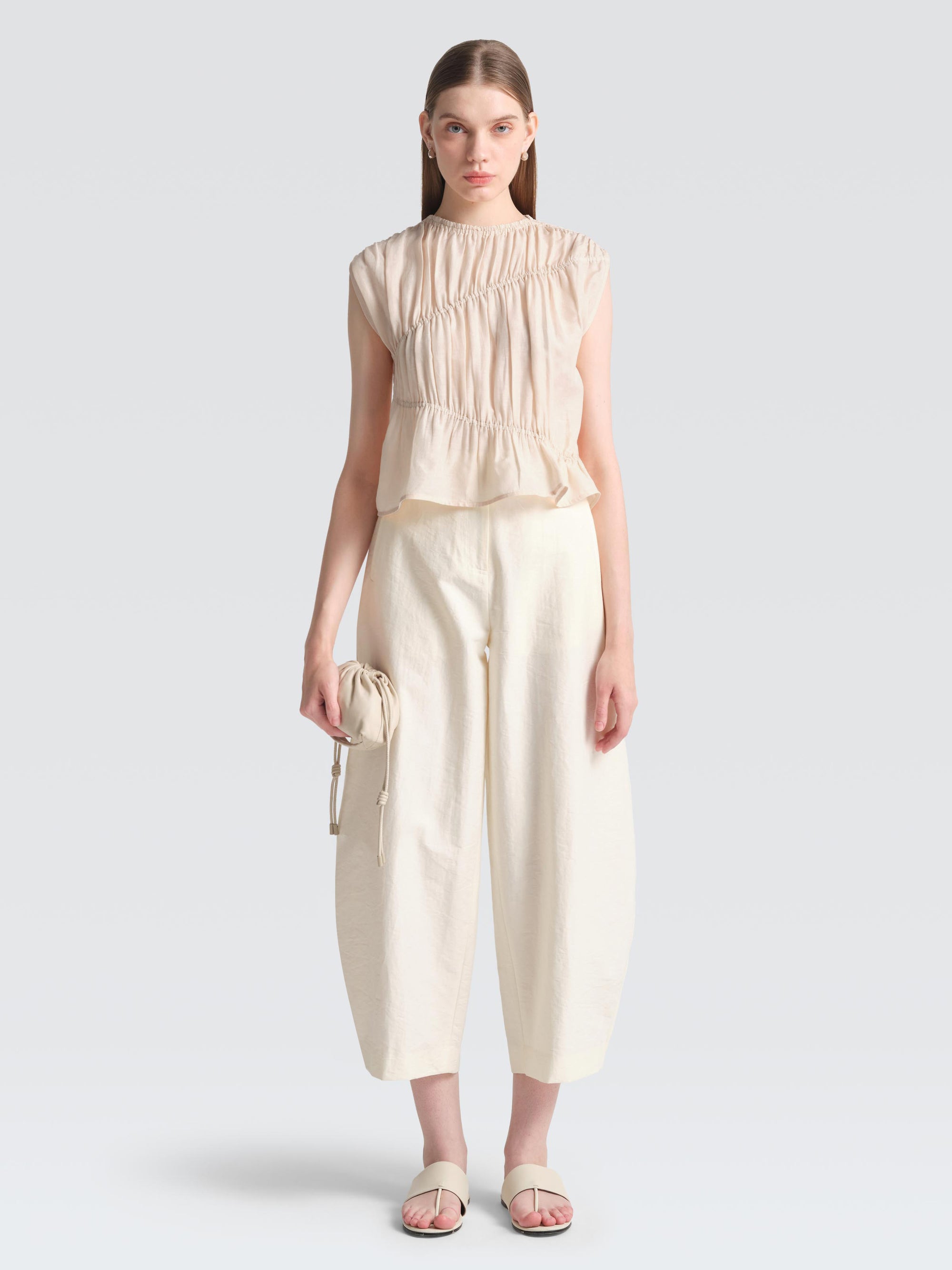 Crafted from lightweight cotton-linen, the EMMY top features a cropped silhouette with shirring across the front and back for subtle texture. A rounded neckline and clean stitching make it an easy, modern piece to pair with high- or mid-rise trousers.