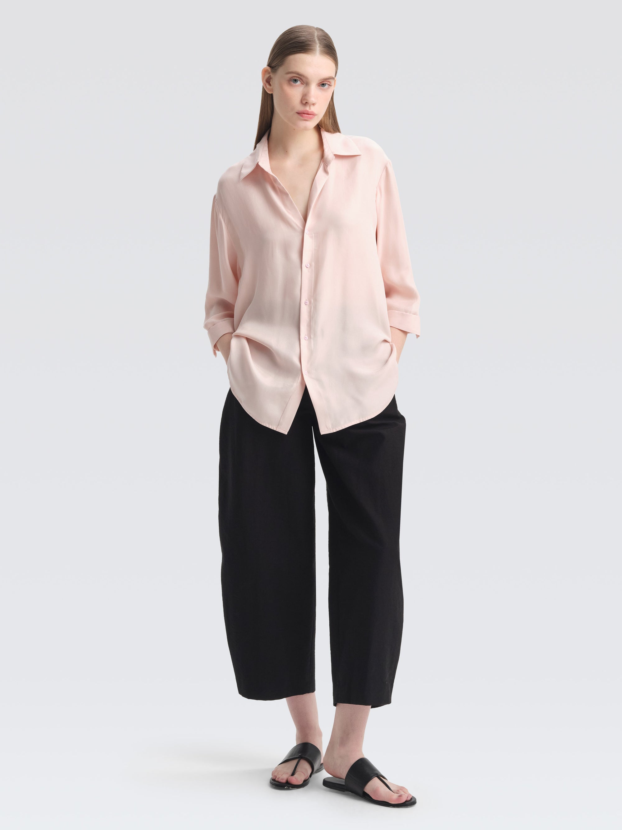 The HUTTON shirt balances relaxed ease with thoughtful detail. Crafted from soft cupro, its dropped shoulders and elongated hem create a loose, fluid fit, while folded cuffs and an open collar let you style it casually or tucked into shorts and tailoring.