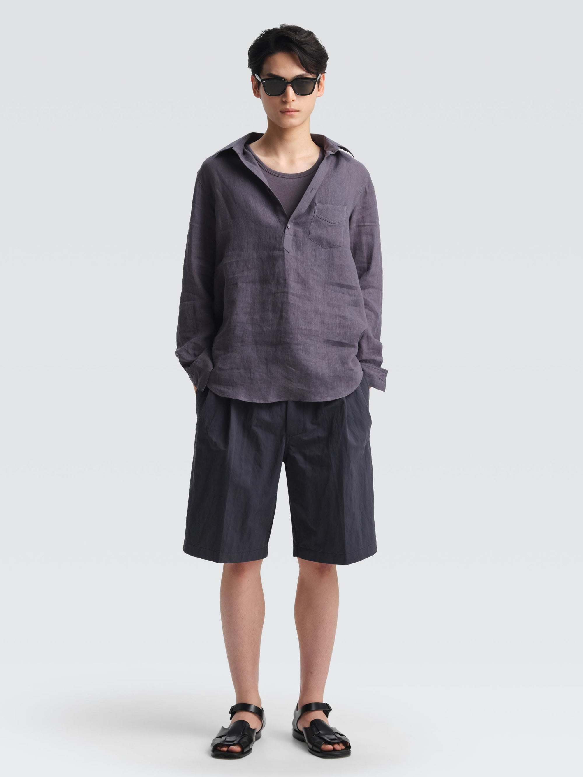 The EWAN shirt brings a quiet ease to warm days. Cut from breathable linen and pre-washed for a lived-in softness, it features a relaxed fit, chest pocket, and half placket. The elongated curved hem lends itself naturally to tunic-style layering over casual trousers or smart shorts.