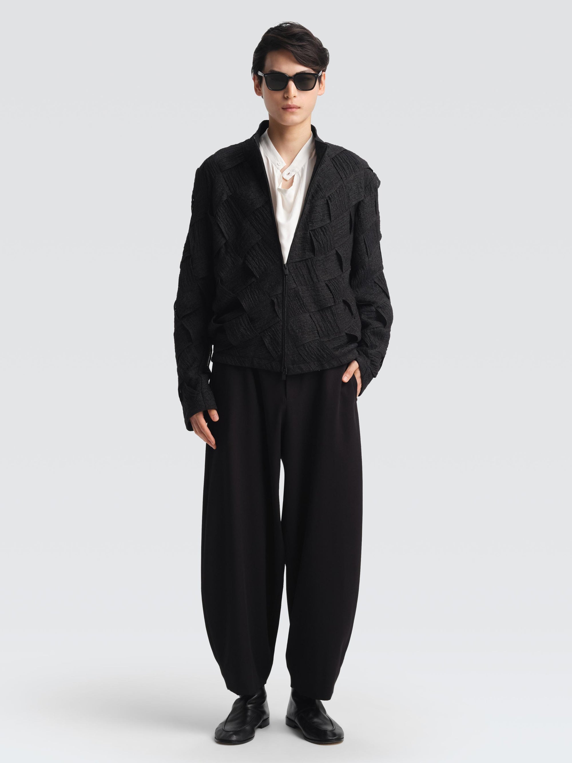 Handcrafted from interlaced strips of mottled, dense gauze linen, the KYLE jacket is a testament to meticulous artisanal precision. Simple in form but expressive in detail, it pairs effortlessly with sleek trousers.