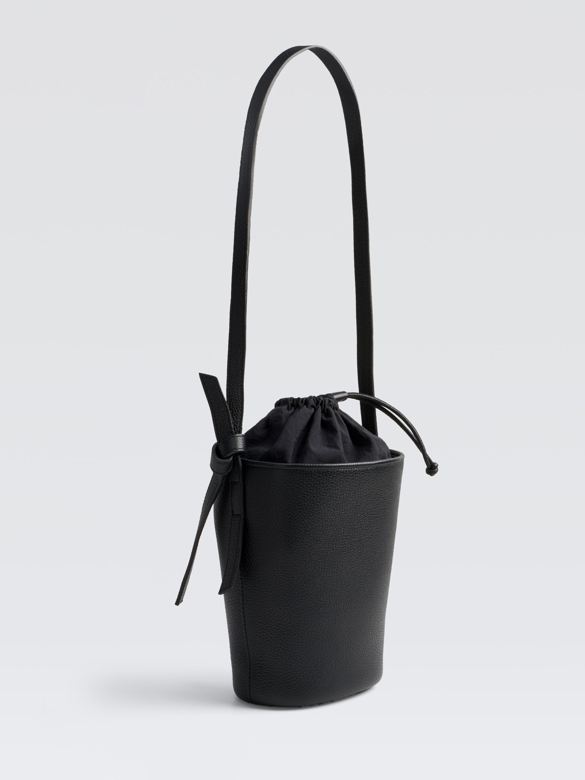 This mini bucket bag offers a contemporary take on a classic silhouette. Meticulously crafted from grained calfskin leather, it features an internal nylon pouch that secures with drawstring fastening and is finished with smooth leather trims. The slender shoulder strap ends in an adjustable knot that takes cues from our signature wrap belts, allowing it to be styled crossbody, on the shoulder, or carried by hand.