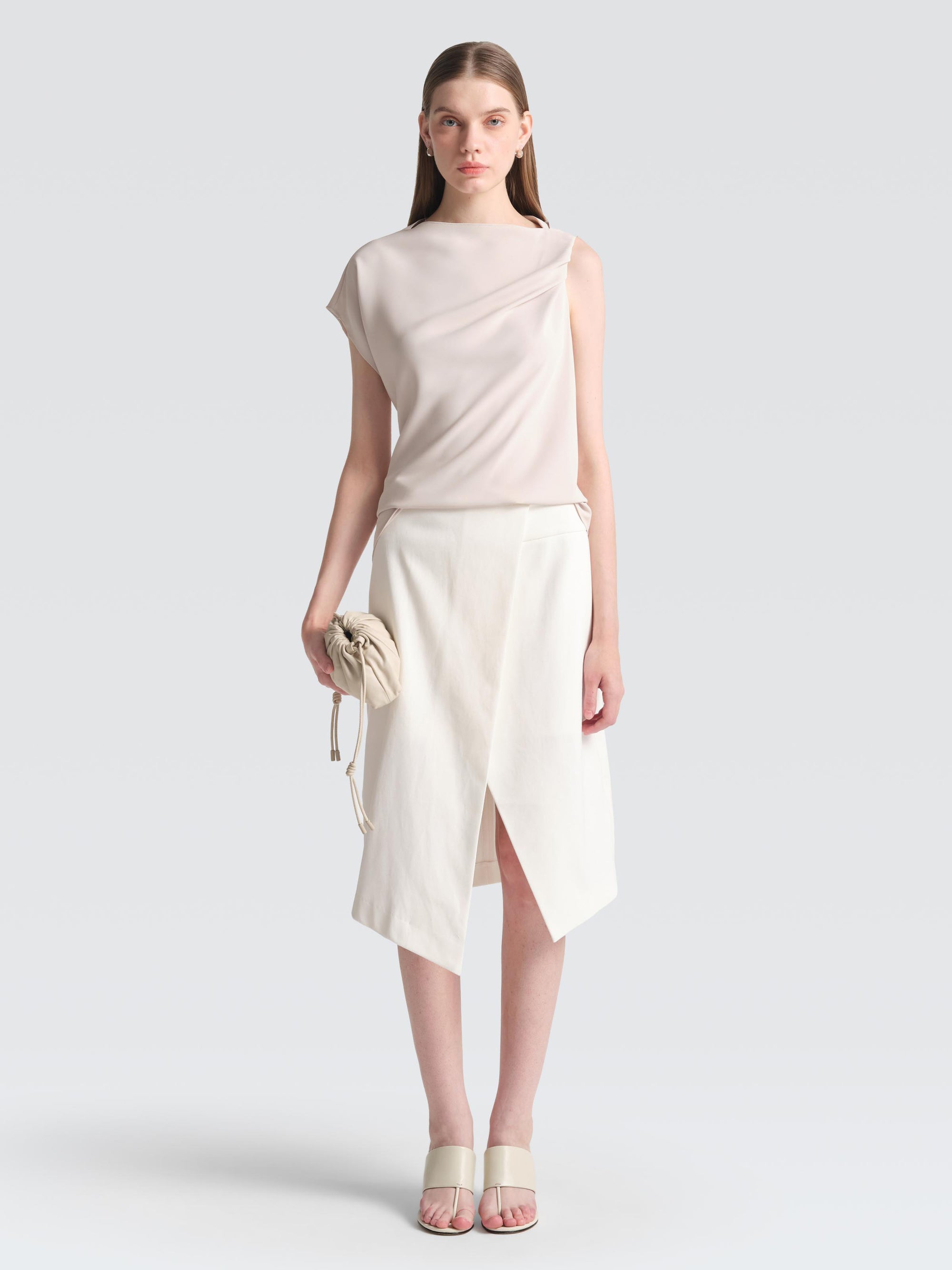 Clean, minimal, and effortlessly refined, the BRUNI top is cut from smooth triacetate with a boat neck, twist detail, and overlapping flange. Wear it with tailored pants for a polished yet easy look—an ideal staple to rotate through your workweek.