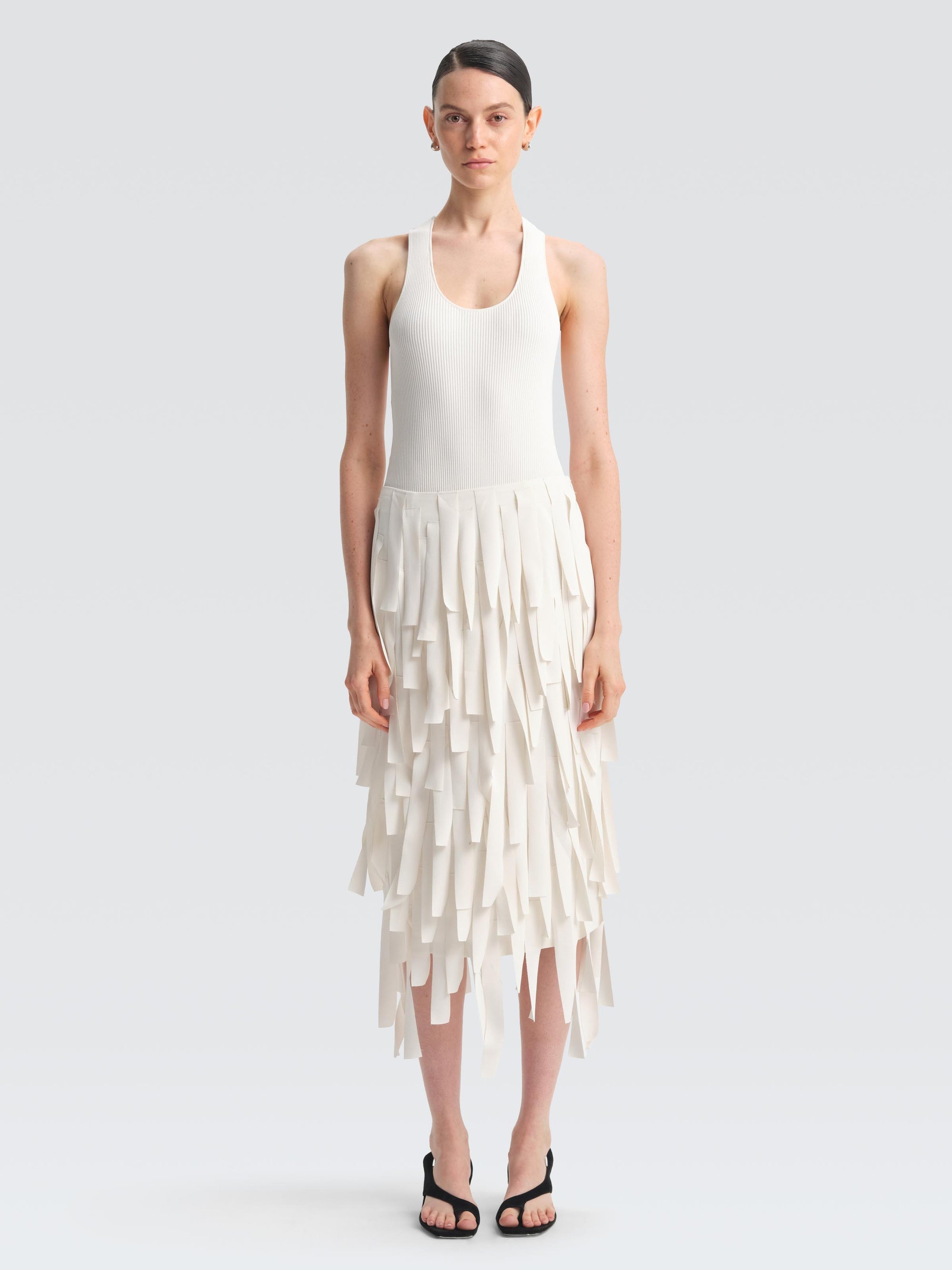 A key style from our runway collection, this triacetate piece is crafted with layered, laser-cut rectangles that create a fringed effect, fluttering beautifully with every movement. Falling just below the knee, it pairs effortlessly with a simple tank to keep the detail in focus.